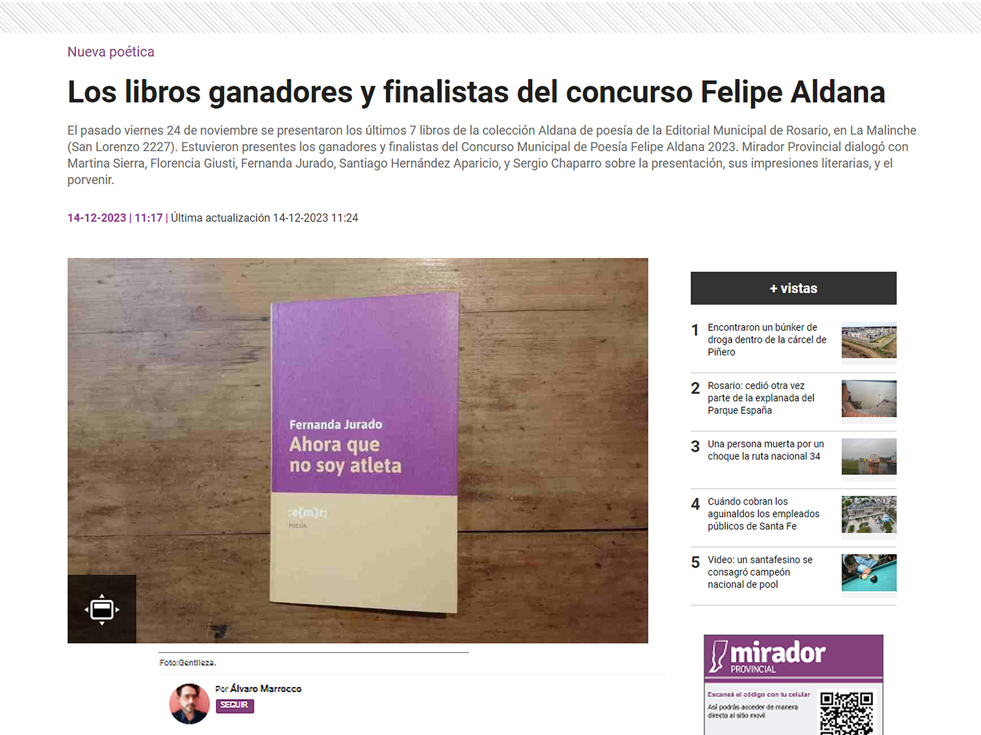 Se presentaron los últimos 7 libros de la colección Aldana de poesía de la Editorial Municipal de Rosario. Los ganadores y finalistas del Concurso Municipal de Poesía Felipe Aldana 2023 fueron: Ahora que no soy atleta, Fernanda Jurado (Venado Tuerto, 1998); Isla Decepción, Santiago Hernández Aparicio (Salta, 1990); En el corazón de un país sin nombre, Manuel Bozzo (Rosario, 2004); Perros estrellas canciones, Florencia Giusti (Rosario, 1989); Urbanismo personal, Martina Sierra (Pergamino, 1994); La galería y otros lugares, Sergio Chaparro (Caacupé, 1998); Un ataúd en forma de auto deportivo, Andrés Yeah (Rosario, 1987).