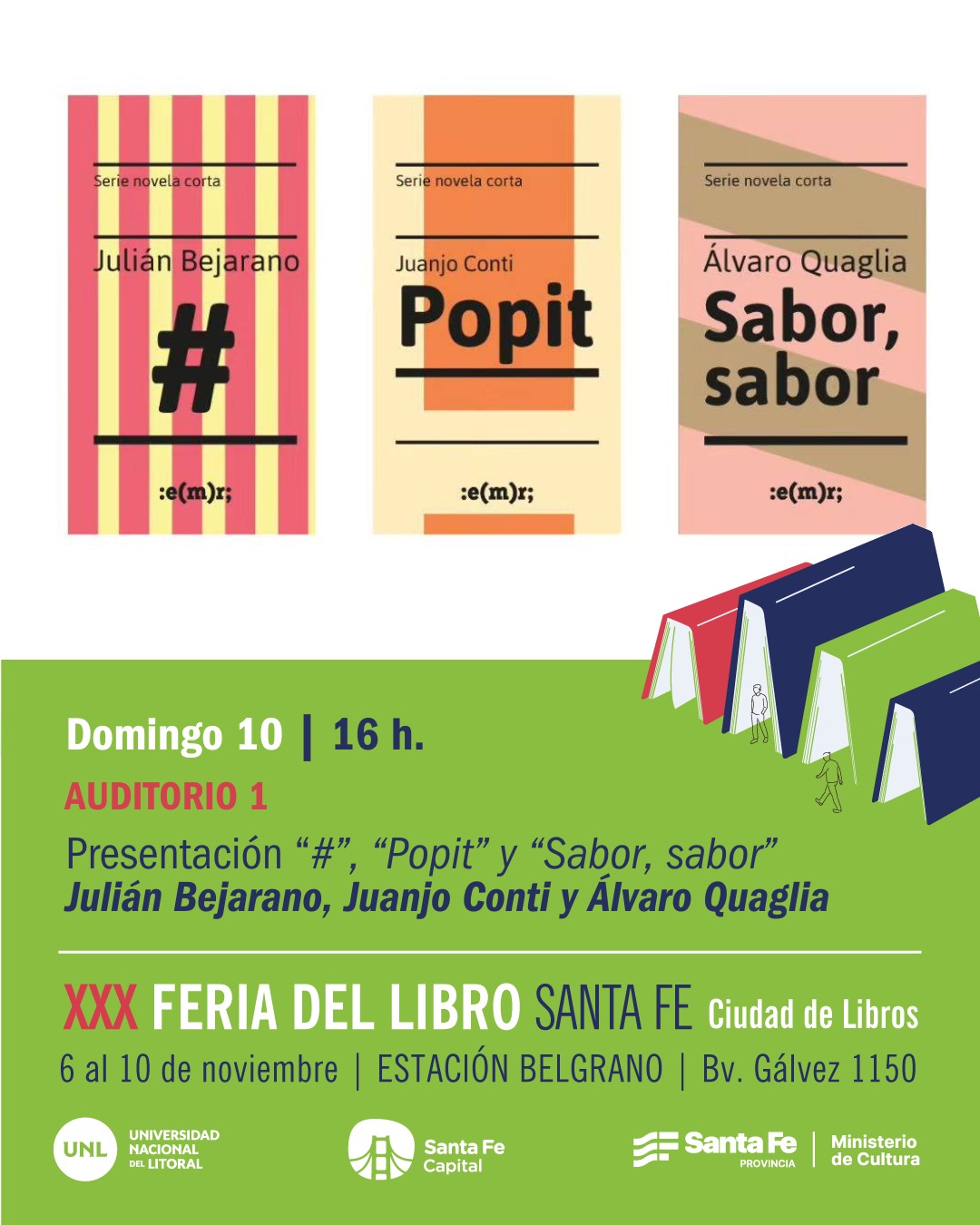 En el marco de la XXX Feria del Libro de Santa Fe, el domingo 10 de noviembre a las 16 h, en el Auditorio 1 de Estación Belgrano (Bv Gálvez 1150, Santa Fe), se presentarán las tres obras ganadoras del Concurso Regional de Nouvelle EMR 2024: "#" de Julián Bejarano (Paraná), "Popit" de Juanjo Conti (Santa Fe) y "Sabor, sabor" de Álvaro Quaglia (Santa Fe). Para la presentación los autores estarán en diálogo con la escritora y docente Analía Giordanino.