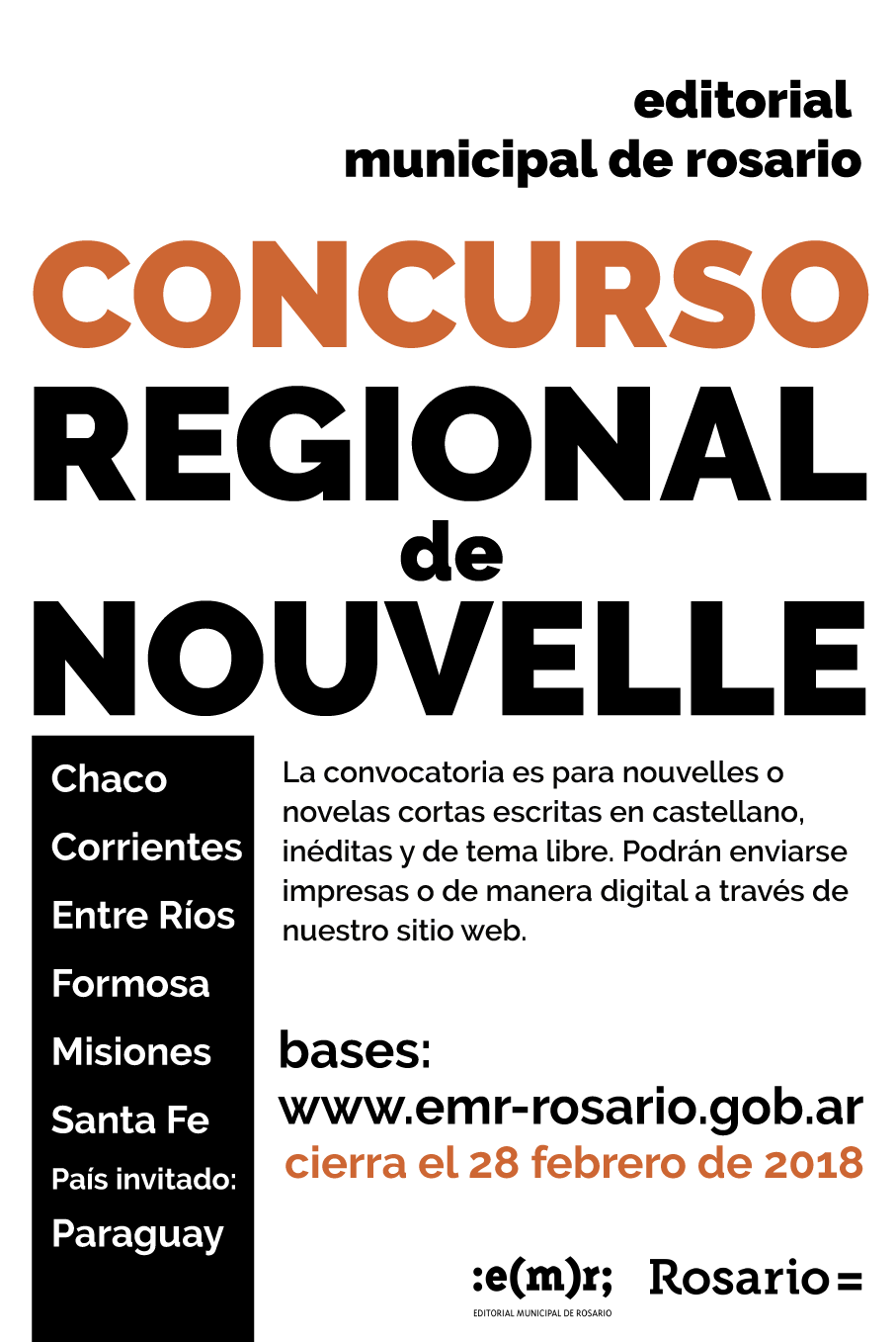 La Secretaría de Cultura y Educación de la Municipalidad de Rosario, a través de la Editorial Municipal de Rosario, convoca al Concurso Regional de Nouvelle EMR 2018. Podrán participar escritores nacidos o residentes en las provincias argentinas de Chaco, Corrientes, Entre Ríos, Formosa, Misiones y Santa Fe, y en la República de Paraguay, sin límite de edad. La convocatoria es para nouvelles escritas en idioma castellano, inéditas y de tema libre, de una extensión que no deberá ser inferior a 70.000 (setenta mil) ni superar 130.000 (ciento treinta mil) caracteres con espacio. No podrán participar aquellas obras que hubiesen recibido premios o menciones en cualquier otro concurso, o se hallaren pendientes del fallo de ningún otro premio.