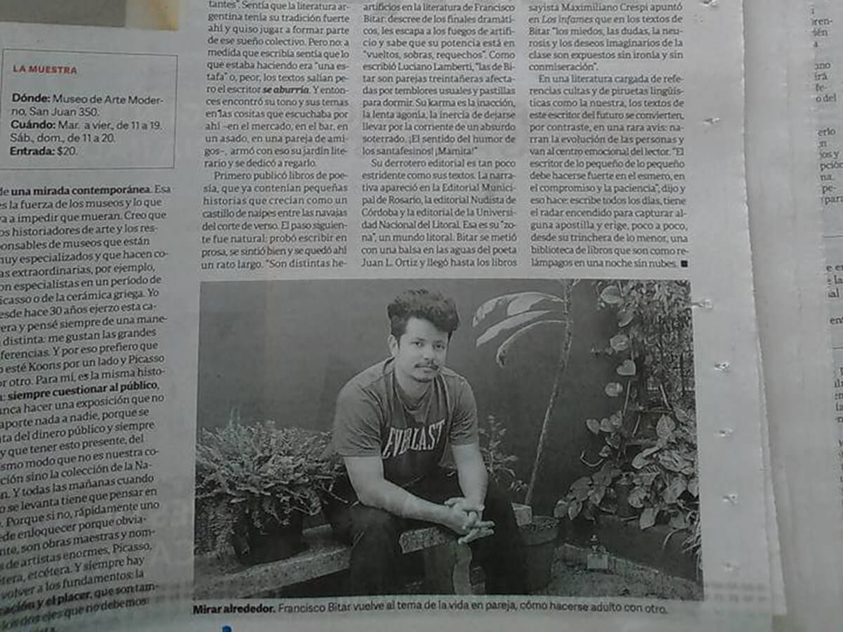 Por Mauro Libertella. No hay artificios en la literatura de Francisco Bitar: descree de los finales dramáticos, les escapa a los fuegos de artificio y sabe que su potencia está en “vueltos, sobras, requechos”. Como escribió Luciano Lamberti, “las de Bitar son parejas treintañeras afectadas por temblores usuales y pastillas para dormir. Su karma es la inacción, la lenta agonía, la inercia de dejarse llevar por la corriente de un absurdo soterrado. ¡El sentido del humor de los santafesinos! ¡Mamita!” Su derrotero editorial es tan poco estridente como sus textos. La narrativa apareció en la Editorial Municipal de Rosario, la editorial Nudista de Córdoba y la editorial de la Universidad Nacional del Litoral.Editorial